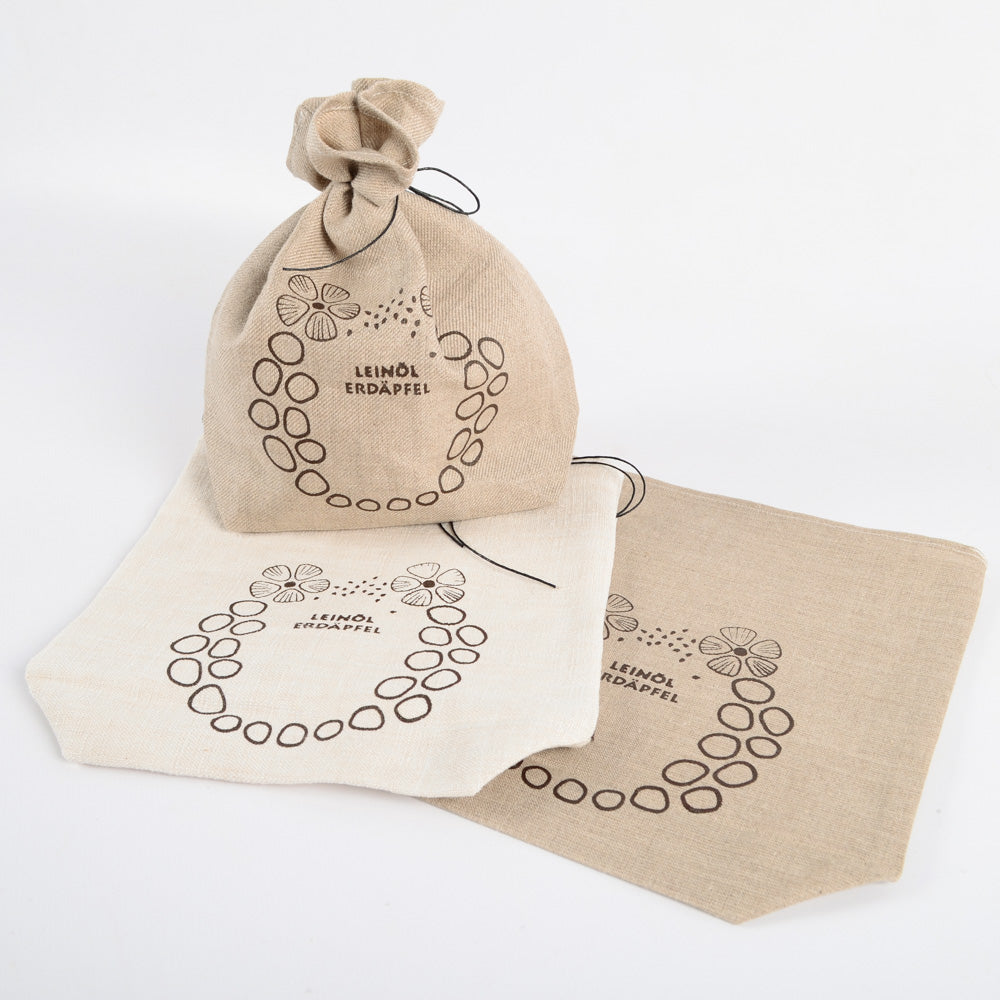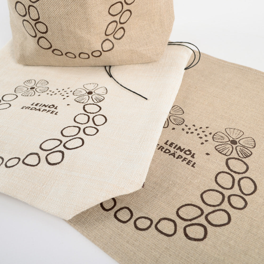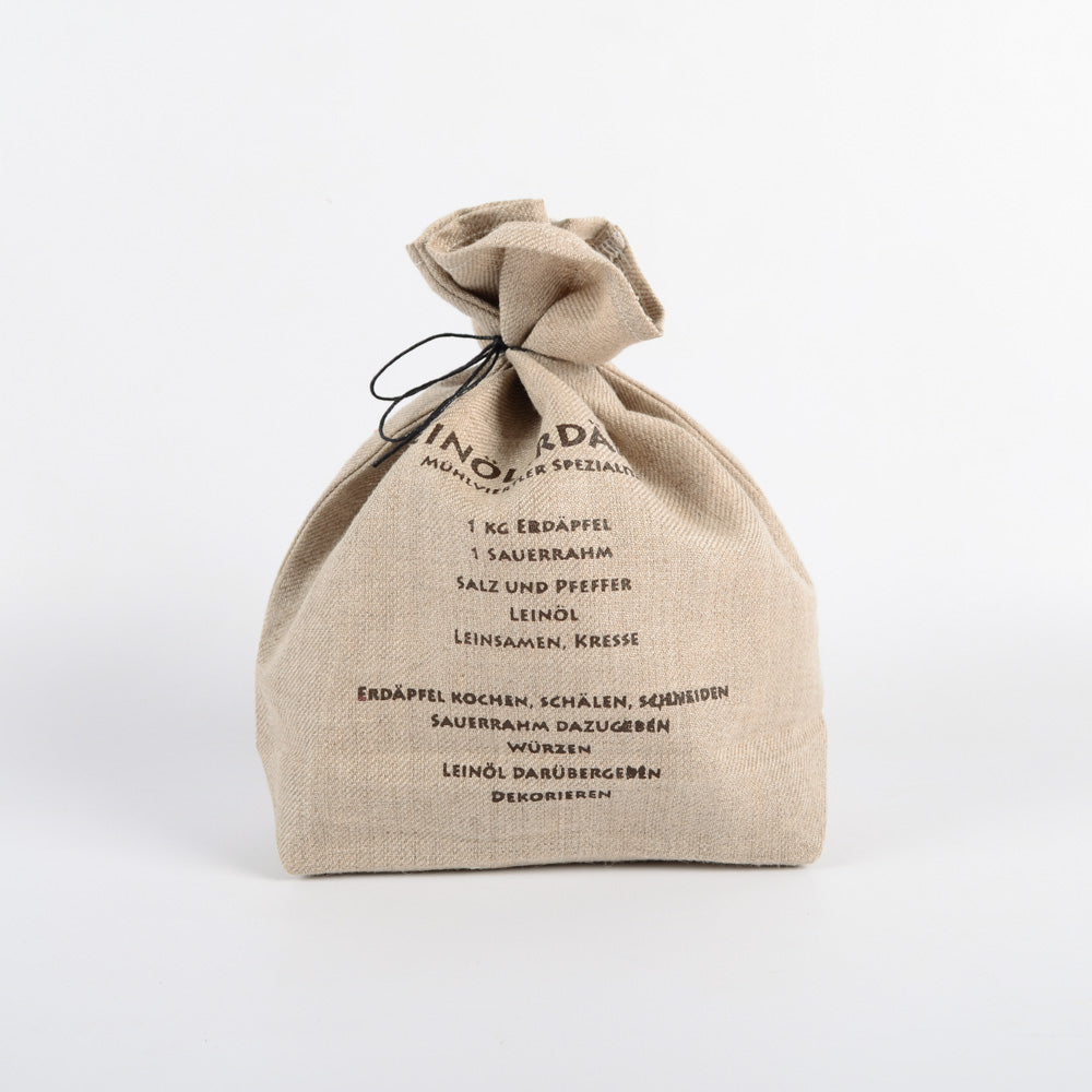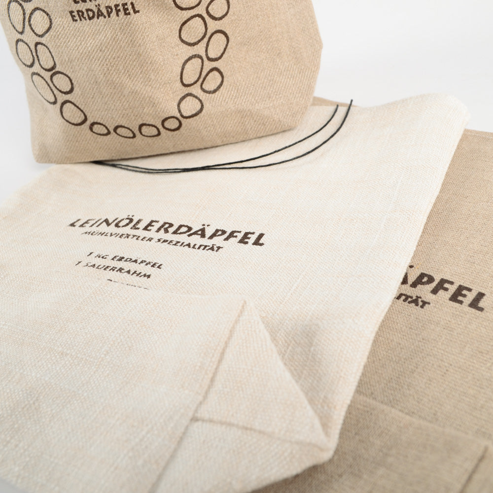 Sackerl aus altem Leinen mit Druck Rezept Leinölerdäpfel