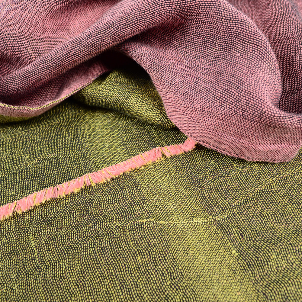 zwei unterschiedlich farbige Seiten, eine aus Leinen, eine aus Baumwolle, zwei farbintensive Mittelstreifen durch Schussverdichtungen, strukturierte Oberfläche durch Edelknitter